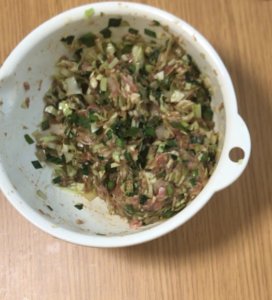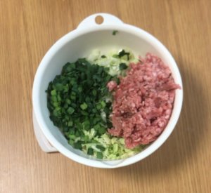 1. キャベツ・ニラ・長ネギをみじん切りにします。