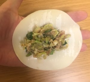5. 餃子の皮に具材をのせて、周りに少し水をつけてから包みます。
