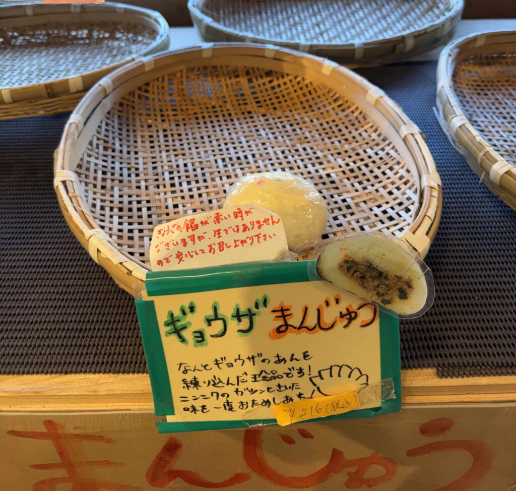 レストランの近くにある、小菅村の道の駅に立ち寄ったら、「ギョウザまんじゅう」を見つけた。