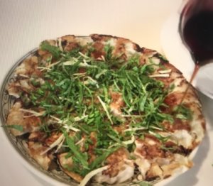 小皿に餃子を乗せてから薬味をのせてもOK。パッと見ると、お好み焼きみたい!